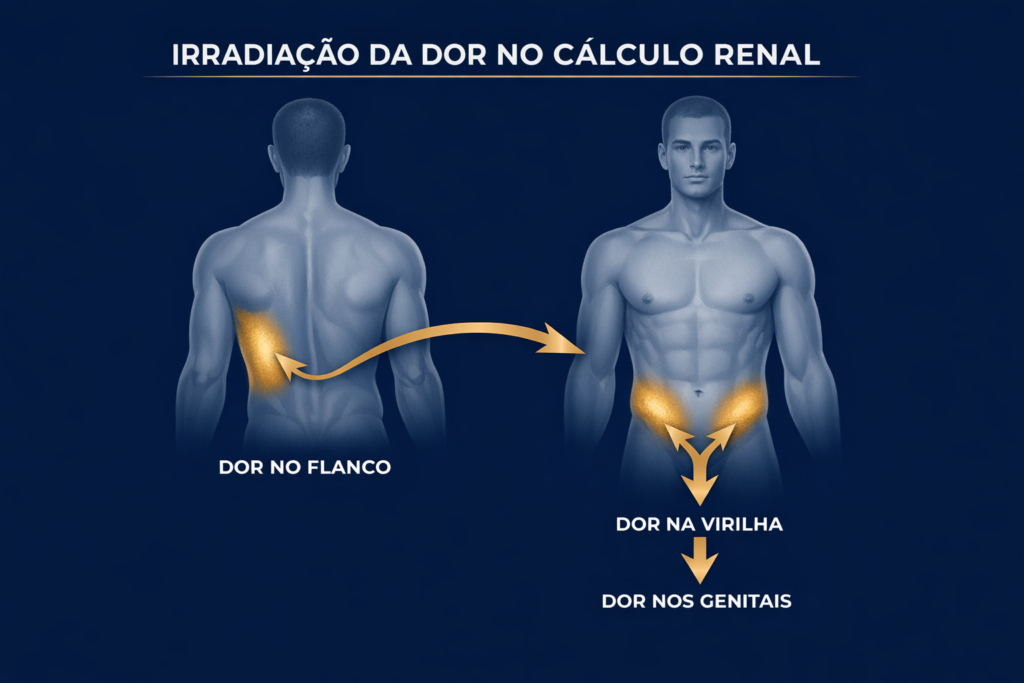 - Dor intensa em cólica no flanco (região lateral do abdome e lombar), que pode irradiar para a virilha, genitais ou face interna da coxa