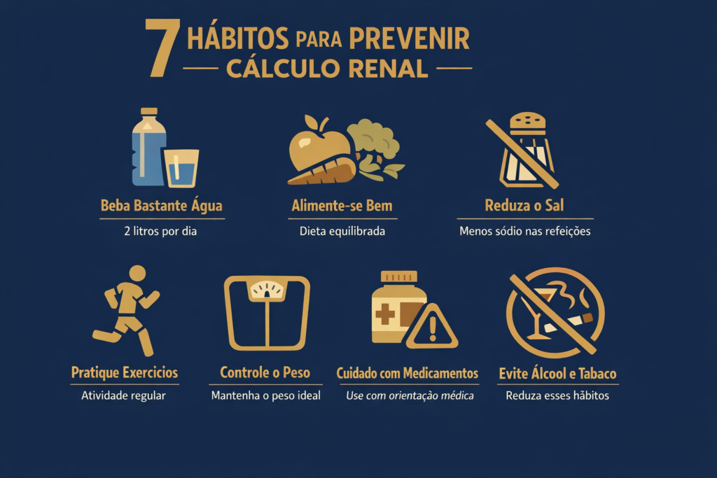 Hipertensão, diabetes, gota e infecções urinárias recorrentes devem ser acompanhadas e tratadas. O controle dessas condições reduz indiretamente o risco de formação de novos cálculos.