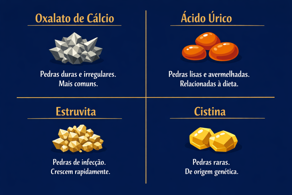 | Exames de sangue (creatinina, ácido úrico, cálcio) | Função renal e perfil metabólico | Auxilia na identificação das causas |
